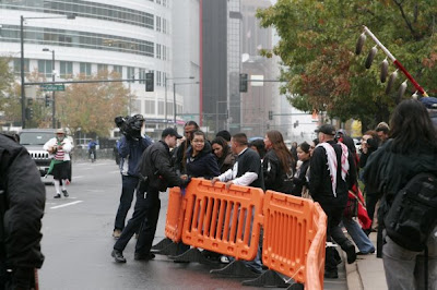 13 Indigenous Women going through the police barrier (the police let them...go figure) to present a Treaty of Transformation to the paraders (that's one there on the left with the striped shirt).